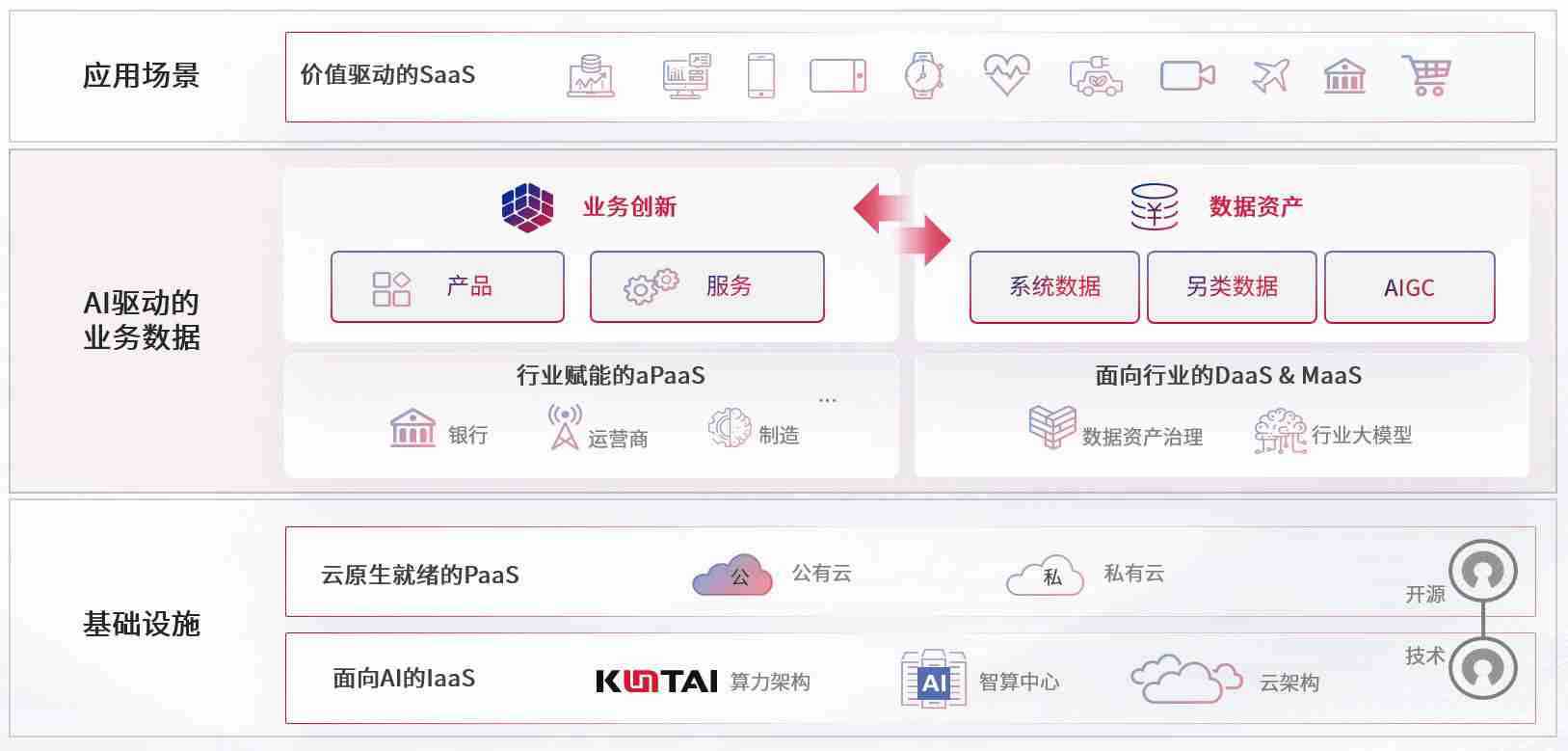 数字时代,,,,围绕企业数字化转型的关键要素,,尊龙旗舰厅数码开创性的提出数云融合战略和技术体系框架,,,,着力在云原生、、、数字原生、、、、AI原生和信创产业上架构产品和服务能力,,,为处在不同数字化转型阶段的快消零售、、汽车、、、、金融、、、医疗、、政企、、、教育、、、运营商等行业客户提供泛在的敏捷IT能力和融合的数据驱动能力,,,构建跨界融合创新的数字业务场景和新业务模式,,,,助力企业级客户建立面向未来的核心能力和竞争优势,,全面推动社会的数字化、、、、智能化转型升级。。