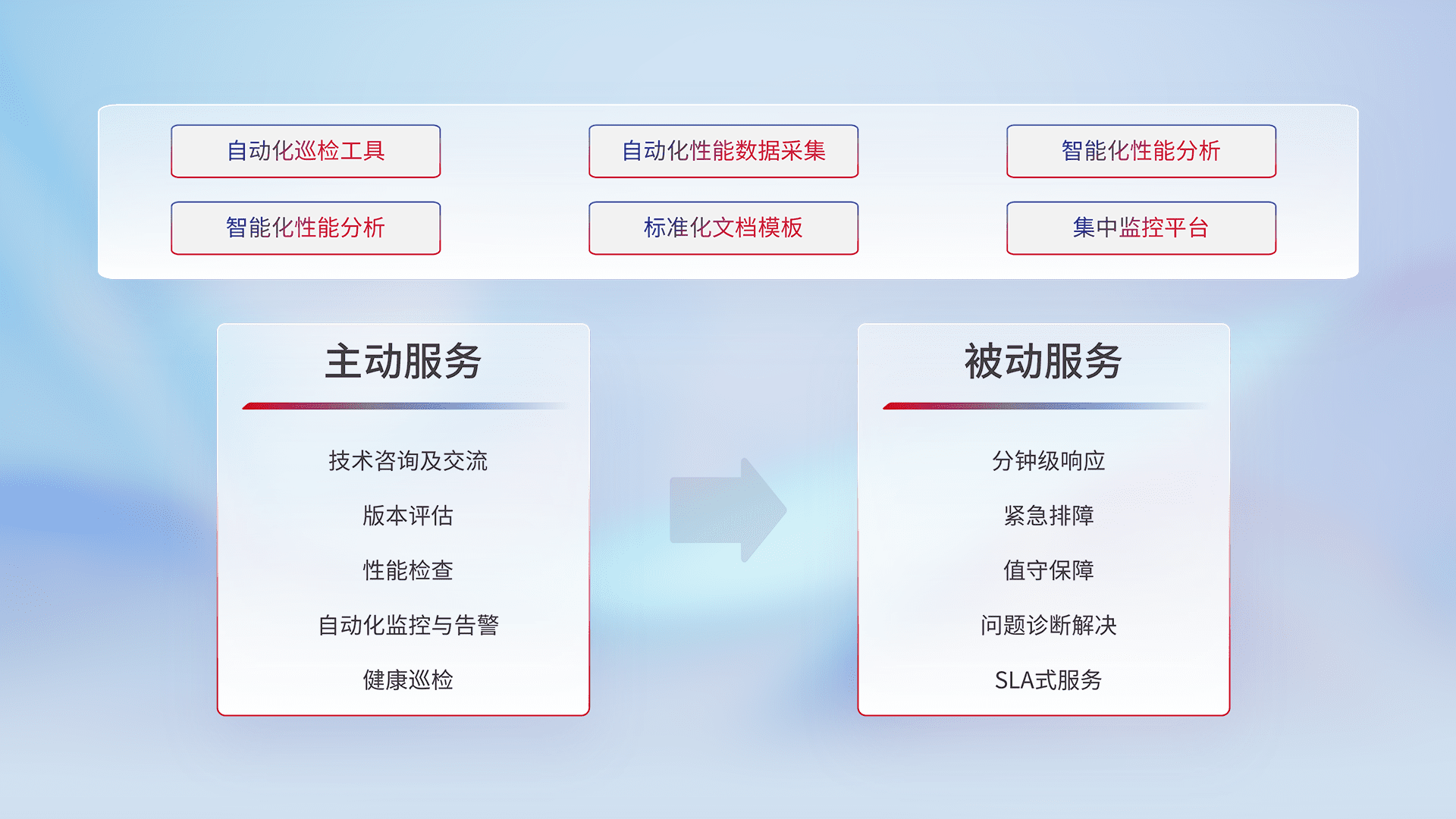 智能化工具和标准化文档,,,,保障服务质量,,,提供主动服务(包含技术咨询、、、、版本评估、、、、性能检查、、自动化监控与告警、、、、健康巡检)和被动服务包含(分钟级响应、、、、紧急排障、、、值守保障、、、问题诊断解决、、、、SLA服务)。。